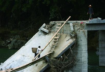再往前,就是这次洪灾的制造者——望谟河。5月26日、27日接连两天的暴雨令望谟河水位猛涨,惟一和外界连接的小桥被彻底冲垮。剩下摇摇欲坠的半座桥加上几根竹子,成了这个村子和外界的惟一通道。