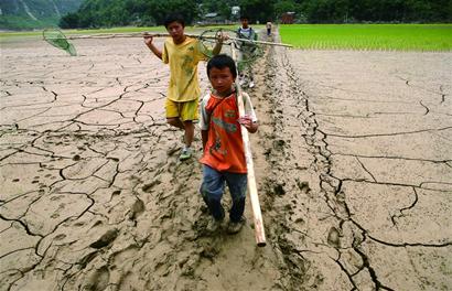 隔着小溪,洪水退去留下将近一尺厚的淤泥覆盖着整片的田地。这是村里面积最大的耕地,整个村子就是围绕山脚下这块惟一的耕地展开。一条小路把这块占地数亩的整片淤泥一分为二。洪水以前,它要分为几十块给十多户人耕种。现在,在它两边看不见一棵庄稼的影子。