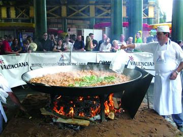 一打听才知道,原来是西班牙滨海城市瓦伦西亚的大厨师在现场制作海鲜饭(paella)。paella在西班牙语里的本意是“煎锅”,它使用的主要原料不只是海鲜,甚至要有鸡肉和兔肉才地道。此外,还要加入蔬菜、大米、蕃红花和橄榄油。据说这道菜最初是摩尔人占领西班牙期间王宫贵族宴席上的剩菜,由仆人重新炒过之后再带回家食用。